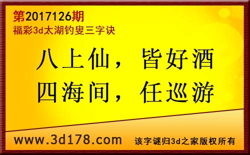 3d第17126期太湖字谜:八上仙,皆好酒,四海间,任巡游
