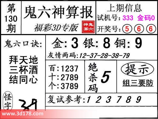 3d第17130期鬼六神算报为您推荐鬼六口诀: