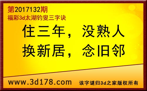 3d第17132期太湖字谜:住三年,没熟人,换新居,念旧邻
