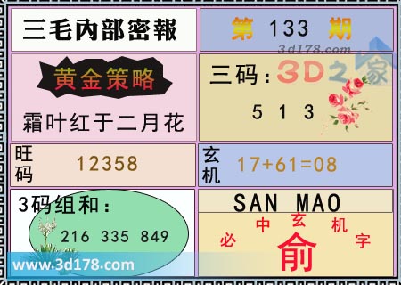 福彩3d第17133期三毛内部密报综合推荐如下: