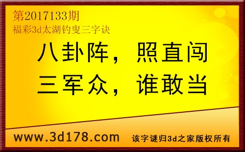 3d第17133期太湖字谜:八卦阵,照直闯,三军众,谁敢当