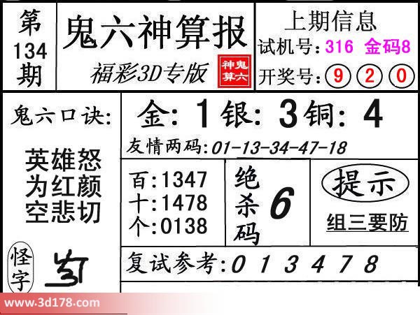 3d第17134期鬼六神算报为您推荐鬼六口诀: