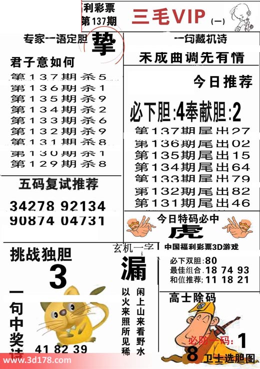 3d第2017137期三毛VIP详解:一句藏机诗:未成曲调先有情