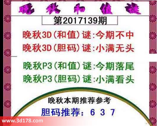 晚秋p3(和值)谜:今期落尾
