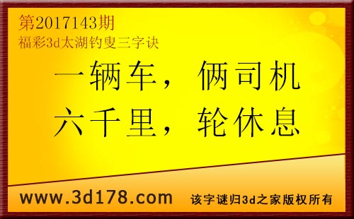 3d第17143期太湖字谜:一辆车,俩司机,六千里,轮休息福彩3d第2017143期太湖图库解析:一辆车:有一辆车子,有1看4;俩司机:里面有两个司机,解4看2;六千里:六千里远的路,看6有3;轮休息:轮流休息,解2防7;六码复式:123467精选10注:123 234 158 269 367 025 158 367 459 4563d太湖图库由3d之家3d图库频道原创,仅供彩民参考,温馨提供。