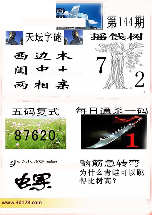 3d香港彩报第17144期摇钱树:本期3d香港彩报图详情如下:天坛字谜:西边木、闺中土、两相亲摇钱树:7 2五码复式:02678每日通杀一码:1脑筋急转筋:为什么青蛙可以跳得比树高?该香港彩报由3d之家3d图库频道原创,仅供彩民参考,温馨提供。