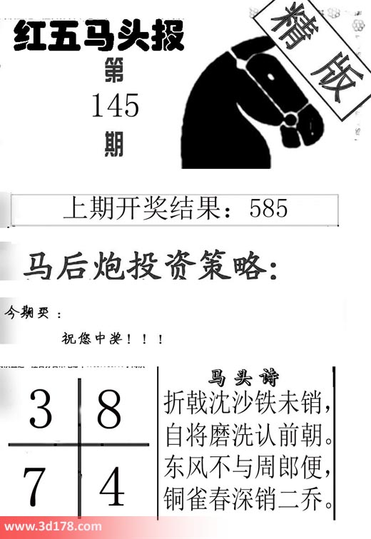 3d第2017145期红五马头报本期马头诗详解:上期开奖号码:585