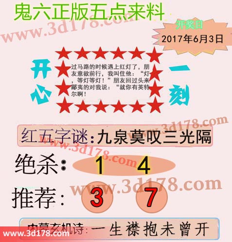 3d鬼六五点来料详解第2017147期:字谜:九泉莫叹三光隔