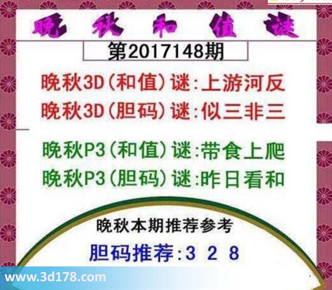 晚秋3D(和值)谜:上游河反