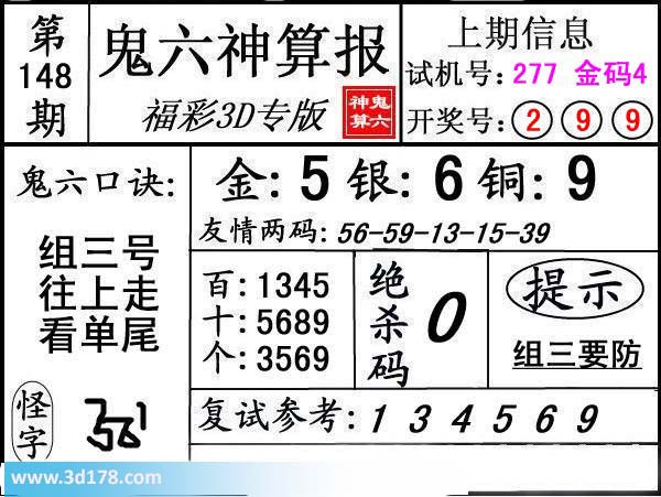 3d第17148期鬼六神算报为您推荐鬼六口诀: