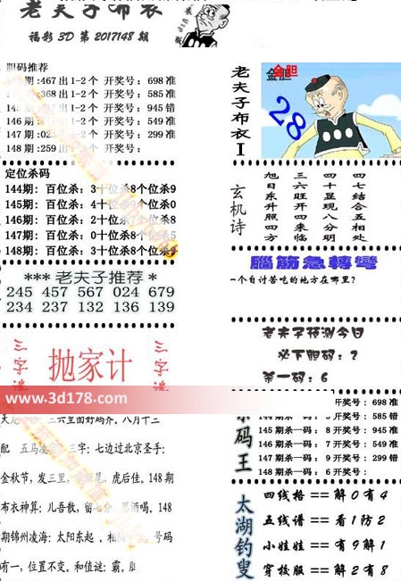 福彩3d第2017148期老夫子布衣图详情:148期:259 出1-2个 开奖号:148期:百位杀3 十位杀8 个位杀9老夫子精选推荐:245 457 567 024 679 234 237 132 136 139老夫子预测今日必下胆码7,杀一码6脑筋急转弯:一个自讨苦吃的地方是哪里?该布衣图库由3d之家3d图库频道原创,仅供彩民参考,温馨提供。