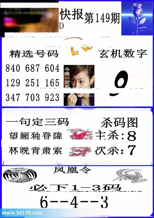 福彩3d凰快报图第17149期精选号码推荐:3d第2017149期凤凰快报内容解析:玄机数字:9精选号码:840 687 604 129 251 165 347 703 923一句定三码:望阙独登陴,林晚青萧索杀码图:主杀:8 次杀:7凤凰令:必下1-3码 6--4--3该凤凰快报图库由3d之家3d图库频道原创,仅供彩民参考,温馨提供。