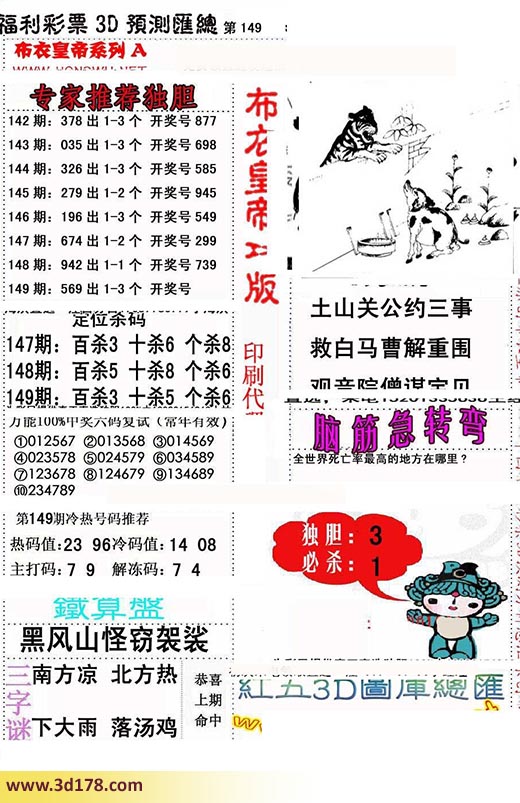 福彩3d第2017149期布衣皇帝A版布衣专家独家推荐:3d之家布衣皇帝第149期详解:149期:569 出1-3个 开奖号定位杀码:百位杀3 十位杀5 个位杀6第149期冷热号码推荐:热码值:23 96冷码值:14 08主打码:7 9解冻码:7 4天机诗:土山关公约三事救白马曹解重围观音院僧谋宝贝铁算盘:黑风山怪窃袈裟三字谜:南方凉 北方热 下大雨 落鸡汤该布衣图库由3d之家3d图库频道原创,仅供彩民参考,温馨提供。