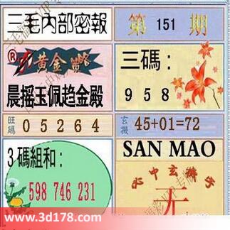 福彩3d第17151期三毛内部密报综合推荐如下:3d之家3d第2017151期三毛内部密报图详解:黄金策略:晨摇玉佩趋金殿三码:589旺码:024563码组合:598 746 231玄机:45+01=72该三毛内部密报图库由3d之家3d图库频道原创,仅供彩民参考,温馨提醒。