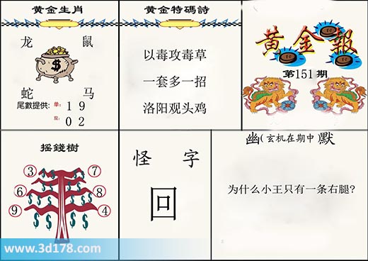福彩第17151期3d黄金报黄金特码:3d之家第151期黄金报详解:黄金特码诗:以毒攻毒草一套多一招洛阳观头鸡黄金生肖:龙蛇鼠马尾数推荐:单:1 9 双:0 2摇钱树推荐号码:369 784怪字:回幽默(玄机在其中):为什么小王只有一条右腿?黄金报图由3d之家3d图库频道原创,仅供彩民参考,温馨提供。