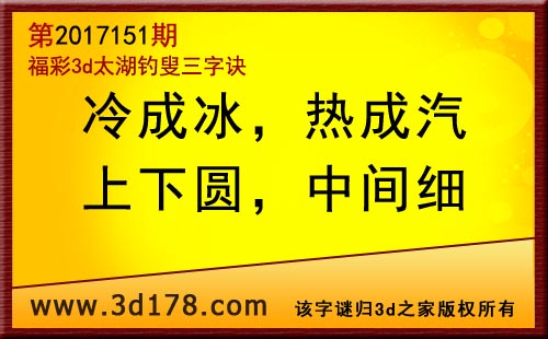 3d第17151期太湖字谜:冷成冰,热成汽,上下圆,中间细