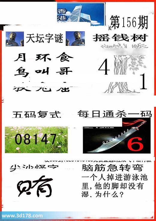 3d香港彩报第17156期摇钱树:本期3d香港彩报图详情如下:天坛字谜:月环食 鸟叫哥 狡兔窟摇钱树:4 1五码复式:01478每日通杀一码:6脑筋急转筋:一个人掉进游泳池里,他的脚却没有湿,为什么?该香港彩报由3d之家3d图库频道原创,仅供彩民参考,温馨提供。
