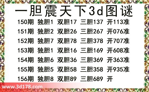 福彩3d第17156期一胆震天下三胆图:本期一胆震天下3d图谜:150期 独胆1 双胆17 三胆137 开113准151期 独胆2 双胆26 三胆267 开076准152期 独胆7 双胆78 三胆378 开707准153期 独胆1 双胆16 三胆169 开608准154期 独胆6 双胆36 三胆369 开363准155期 独胆5 双胆58 三胆358 开935准156期 独胆8 双胆89 三胆689 开一胆震天下三胆图库由3d之家3d图库频道原创,仅供彩民参考,温馨提供。