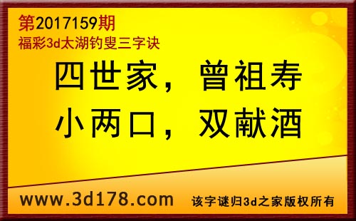 3d第17159期太湖字谜:四世家,曾祖寿,小两口,双献酒