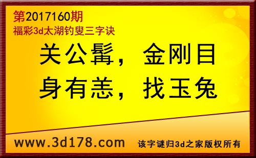 3d第17160期太湖字谜:关公髯,金刚目,身有恙,找玉兔