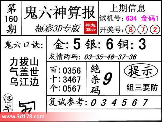 3d第17160期鬼六神算报为您推荐鬼六口诀: