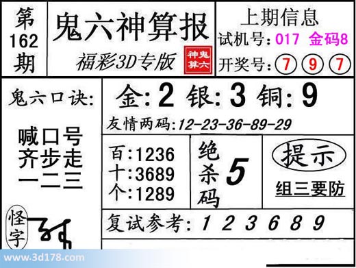 3d第17162期鬼六神算报为您推荐鬼六口诀: