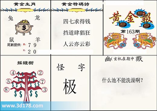 福彩第17163期3d黄金报黄金特码:3d之家第163期黄金报详解:黄金特码诗:四七求得钱挡道肆猖狂人云亦云彩黄金生肖:兔龙鼠羊尾数推荐:单:7 9 双:2 0摇钱树推荐号码:458 273怪字:极幽默(玄机在其中):什么池不能洗澡啊?黄金报图由3d之家3d图库频道原创,仅供彩民参考,温馨提供。