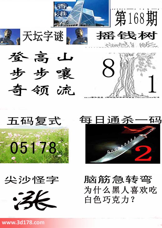 3d香港彩报第17168期摇钱树:本期3d香港彩报图详情如下:天坛字谜:登高山 步步嚷 奇领流摇钱树:8 1五码复式:01578每日通杀一码:2脑筋急转筋:为什么黑人喜欢吃白色巧克力?该香港彩报由3d之家3d图库频道原创,仅供彩民参考,温馨提供。