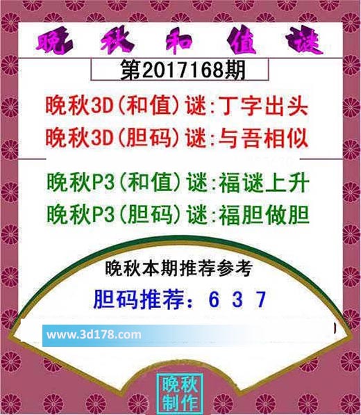 福彩3d红五晚秋图第17168期3d推荐:3d之家3d红五晚秋图第2017168期为您推荐分析:晚秋3D(和值)谜:丁字出头晚秋3D(胆码)谜:与吾相似晚秋p3(和值)谜:福谜上升晚秋p3(胆码)谜:福胆做胆胆码推荐:367该红五图库由3d之家3d图库频道原创,仅供彩民参考,温馨提供。