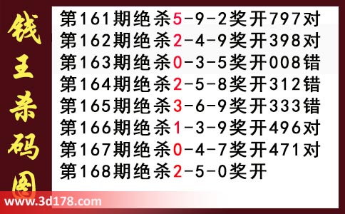 第2017168期3d钱王杀码图杀号推荐分析:近期3d钱王杀码具体详情:第161期绝杀5-9-2奖开797对第162期绝杀2-4-9奖开398对第163期绝杀0-3-5奖开008错第164期绝杀2-5-8奖开312错第165期绝杀3-6-9奖开333错第166期绝杀1-3-9奖开496对第167期绝杀0-4-7奖开471对第168期绝杀2-5-0奖开该钱王杀码图由3d之家3d图库频道原创,仅供彩民参考,温馨提供。