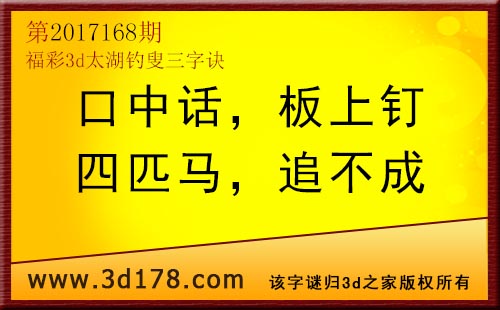 3d第17168期太湖字谜:口中话,板上钉,四匹马,追不成