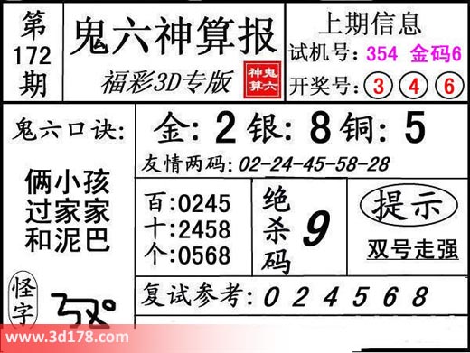 3d第17172期鬼六神算报为您推荐鬼六口诀: