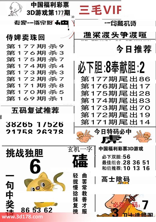 福彩3d第2017177期三毛VIP:3d第2017177期三毛VIP详解:一句藏机诗:渔梁渡头争渡喧第2017177期挑战独胆:6必下胆:8 奉献胆:2五码复式推荐:38265 17526 21758 26378今日特码必中:虎最佳组合:28 36 51和值推荐:10 13 16玄机一字:碡一句中奖诗:曲罢常教善才服,轻拢慢捻抹复挑。该三毛玄机解码图由3d之家3d图库频道原创,仅供彩民参考,温馨提供。