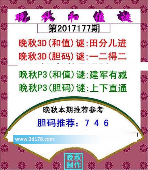 福彩3d红五晚秋图第17177期3d推荐:3d之家3d红五晚秋图第2017177期为您推荐分析:晚秋3D(和值)谜:田分儿进晚秋3D(胆码)谜:一二得二晚秋p3(和值)谜:建军有减晚秋p3(胆码)谜:上下直通胆码推荐:467该红五图库由3d之家3d图库频道原创,仅供彩民参考,温馨提供。