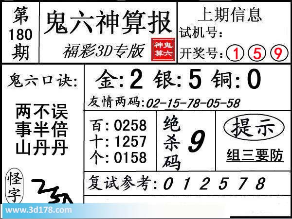 3d第17180期鬼六神算报为您推荐鬼六口诀: