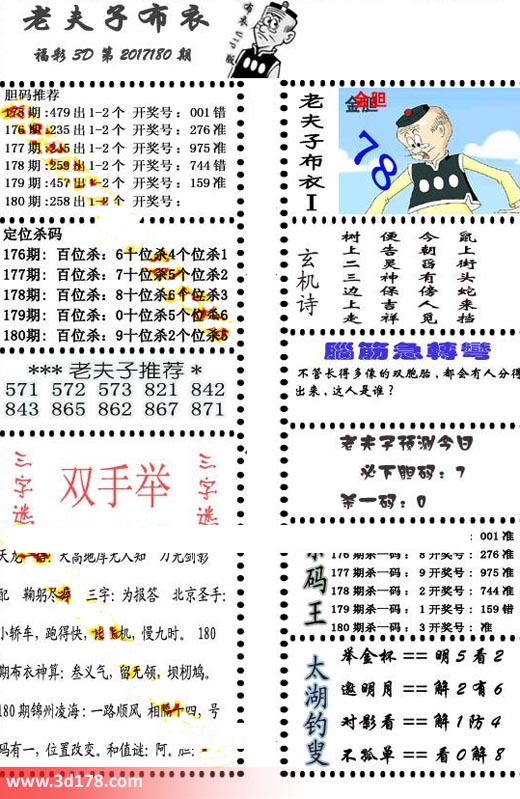 福彩3d第2017180期老夫子布衣图详情:180期:258 出1-2个 开奖号: