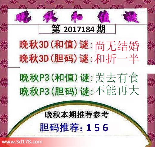 3d之家3d红五晚秋图第2017184期为您推荐分析:晚秋3D(和值)谜:尚无结婚