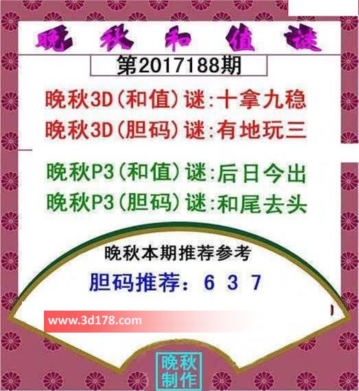 福彩3d红五晚秋图第17188期3d推荐:3d之家3d红五晚秋图第2017188期为您推荐分析:晚秋3D(和值)谜:十拿九稳晚秋3D(胆码)谜:有地玩三晚秋p3(和值)谜:后日今出晚秋p3(胆码)谜:和尾去头胆码推荐:367该红五图库由3d之家3d图库频道原创,仅供彩民参考,温馨提供。