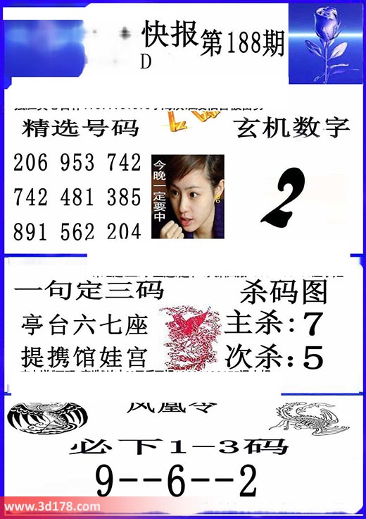 福彩3d凤凰快报图第17188期精选号码推荐:3d第2017188期凤凰快报内容解析:玄机数字:2精选号码:206 953 742 481 385 891 562 204一句定三码:亭台六七座,提携馆娃宫。杀码图:主杀:7 次杀:5凤凰令:必下1-3码 9--6--2该凤凰快报图库由3d之家3d图库频道原创,仅供彩民参考,温馨提供。
