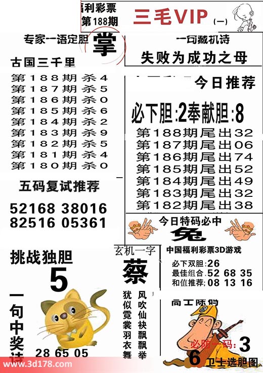 福彩3d第2017188期三毛VIP:3d第2017188期三毛VIP详解:一句藏机诗:失败为成功之母第2017188期挑战独胆:5必下胆:2 奉献胆:8五码复式推荐:52168 38016 82516 05361今日特码必中:兔最佳组合:52 68 35和值推荐:08 13 16玄机一字:蔡一句中奖诗:风吹仙袂飘飘举,犹似霓裳羽衣舞。该三毛玄机解码图由3d之家3d图库频道原创,仅供彩民参考,温馨提供。