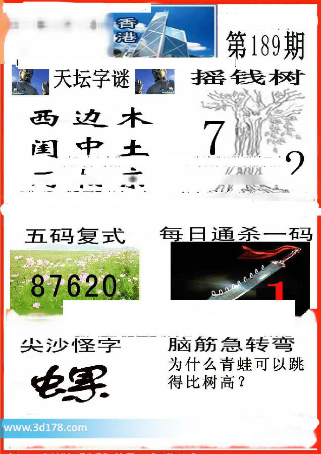 天坛字谜:西边木 闰中土,两相亲摇钱树:2 7五码复式:02678每日通杀一码:1脑筋急转筋:为什么青蛙可以跳得比树高?