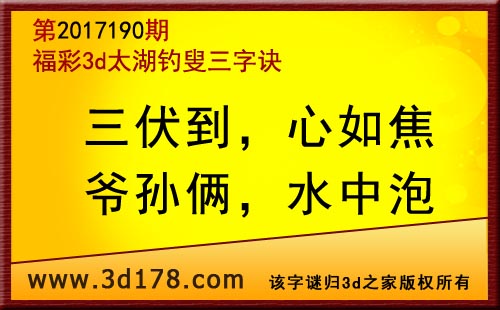 3d第17190期太湖字谜:三伏到,心如焦,爷孙俩,水中泡
