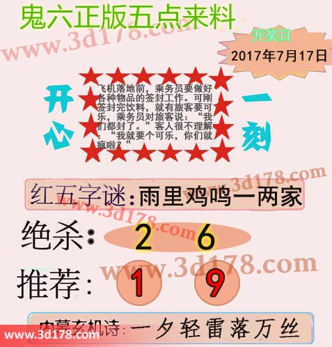 3d鬼六五点来料详解第2017191期:字谜:雨里鸡鸣一两家