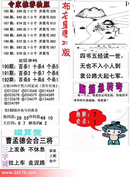 福彩3d第2017192期布衣皇帝A版布衣专家独家推荐:
