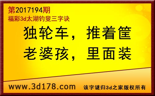 3d第17194期太湖字谜:独轮车,推着筐,老婆孩,里面装