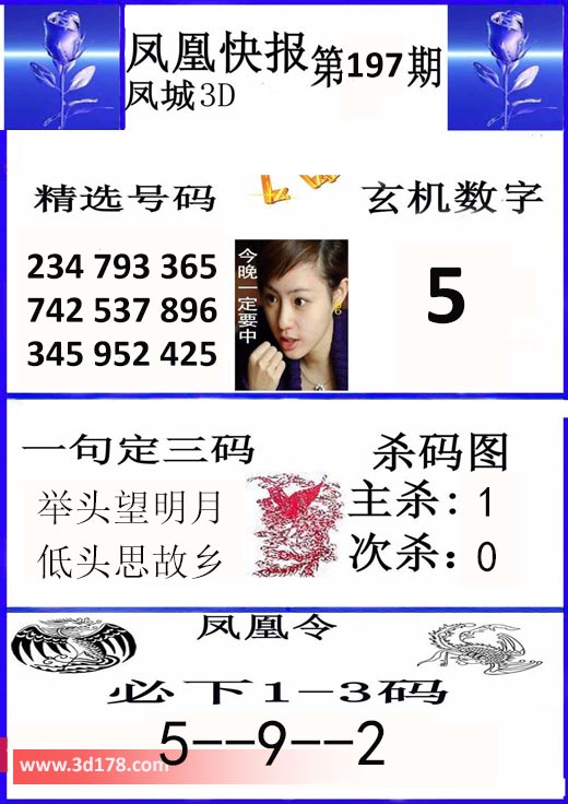 福彩3d凤凰快报图第17197期精选号码推荐:
