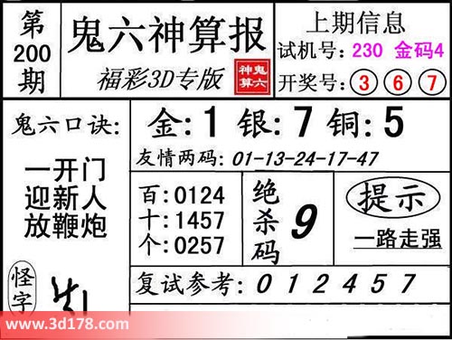3d第17200期鬼六神算报为您推荐鬼六口诀: