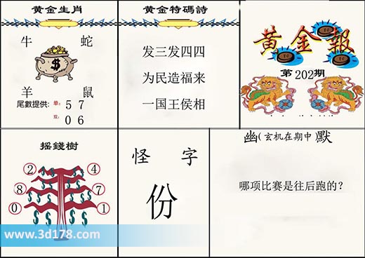 福彩第17202期3d黄金报黄金特码:3d之家第202期黄金报详解:黄金特码诗:发三发四四为民造福来一国王侯相黄金生肖:牛蛇羊鼠尾数推荐:单:5 7 双:0 6摇钱树推荐号码:280 471怪字:份幽默(玄机在其中):哪项比赛是往后跑的?黄金报图由3d之家3d图库频道原创,仅供彩民参考,温馨提供。