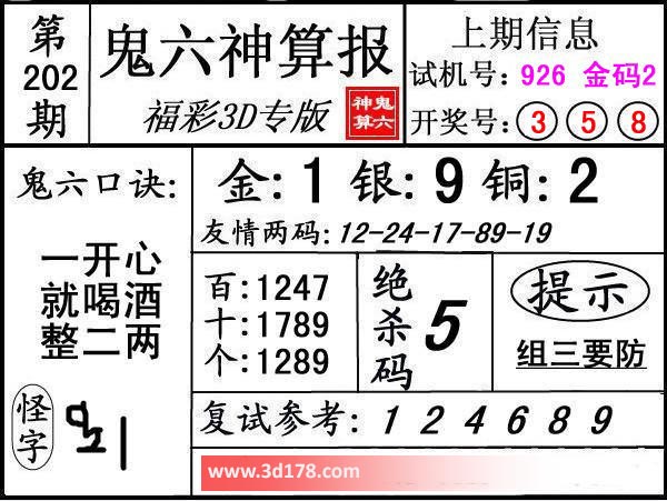 3d第17202期鬼六神算报为您推荐鬼六口诀:本期3d鬼六图库精解如下:复式参考:124689金胆:1,银胆:9,铜胆:2定位复式:百位:1247十位:1789个位:1289绝杀码:5友情两码:12-24-17-89-19该鬼六图库由3d之家3d图库频道原创,仅供彩民参考,温馨提供。
