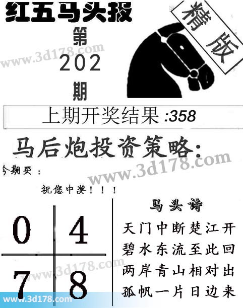 福彩3d第2017202期红五马头报(精版)推荐:3d第2017202期红五马头报本期马头诗详解:上期开奖号码:358天门中断楚江开,碧水东流至此回。两岸青山相对出,孤帆一片日边来。今期买:0478该红五图库由3d之家3d图库频道原创,仅供彩民参考,温馨提供。